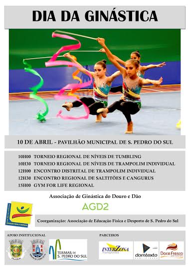Vai decorrer, no dia 10 de Abril de 2016, no Pavilhão Municipal de S. Pedro do Sul, o Dia da Ginástica. Este evento, organizado pela AGD2, conta com a coorganização da Associação de Educação Física e Desporto de S. Pedro do Sul, e será composto pelo Torneio Regional de Níveis (TUM e TRI), Encontro Distrital de Trampolim Individual, Encontro Regional de Saltitões e Cangurus e Gym For Life Regional.
